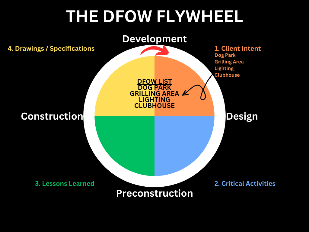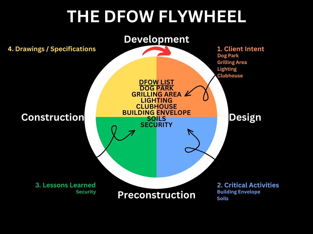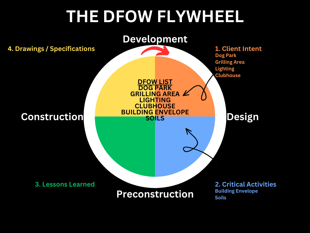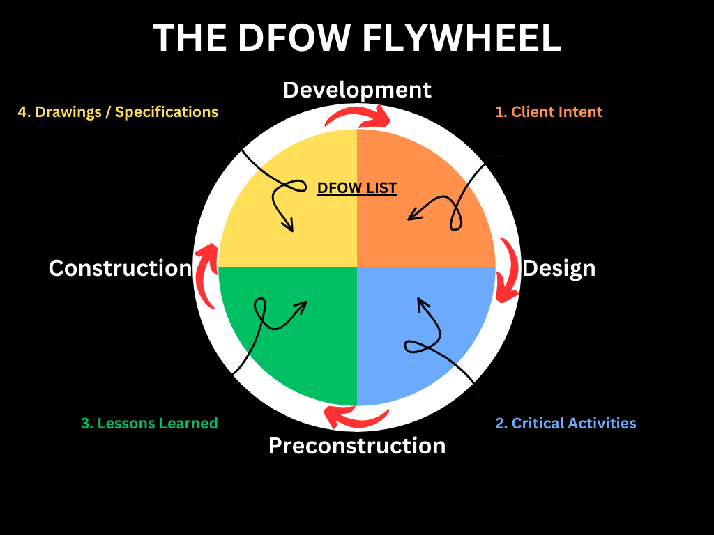 In these early project conversations, the DFOW Flywheel’s rotation begins by identifying critical project elements from the Client Intent, Critical Activities, Lessons Learned categories. Drawings and Specifications still need to be considered given their contents are influenced by the other three categories, but these deliverables do not exist yet.